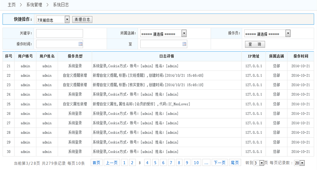系統(tǒng)日志: 1.清理日志:清理日志 可以清除三個(gè)月以前的 一個(gè)月以前的 一周以前的 2.查詢?nèi)罩荆焊鶕?jù)條件查詢數(shù)據(jù)(關(guān)鍵詞、時(shí)間段、按店鋪、按操作員)