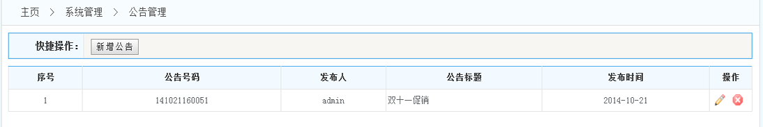 2.公告列表:在公告列表的操作一欄 可以對(duì)改公告進(jìn)行修改和刪除的操作