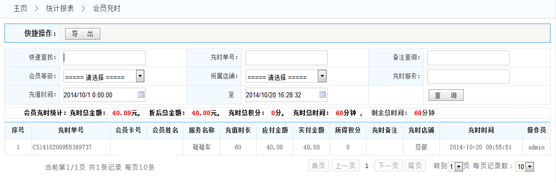 會員充時統(tǒng)計: 1.導出:將按條件查詢到的數(shù)據(jù) 導出成Excel表格 2.會員充時統(tǒng)計:這里顯示了本店鋪的充時概況 3.查詢:按照條件查詢出數(shù)據(jù)(例如根據(jù)會員的店鋪會員的等級等)