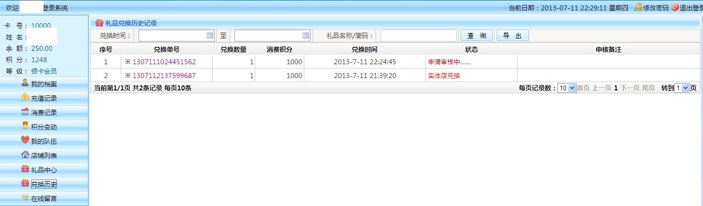消費(fèi)記錄: 1.查詢:可以根據(jù)兌換單號 時(shí)間段 等條件查詢 2.導(dǎo)出:可以將按條件查詢出來的數(shù)據(jù),以Excel表格形式導(dǎo)出 3.列表:雙擊兌換單號,可以查看消費(fèi)詳情 (見下圖)