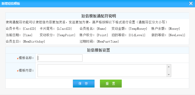系統(tǒng)模版: 一到十一為系統(tǒng)內(nèi)置模板只可以修改不可以刪除(包含積分變動、等級短信、消費短信、積分兌換、提現(xiàn)短信、充值短信、會員登記;)十二以后為用戶自定義短信模板,可編寫,可刪除